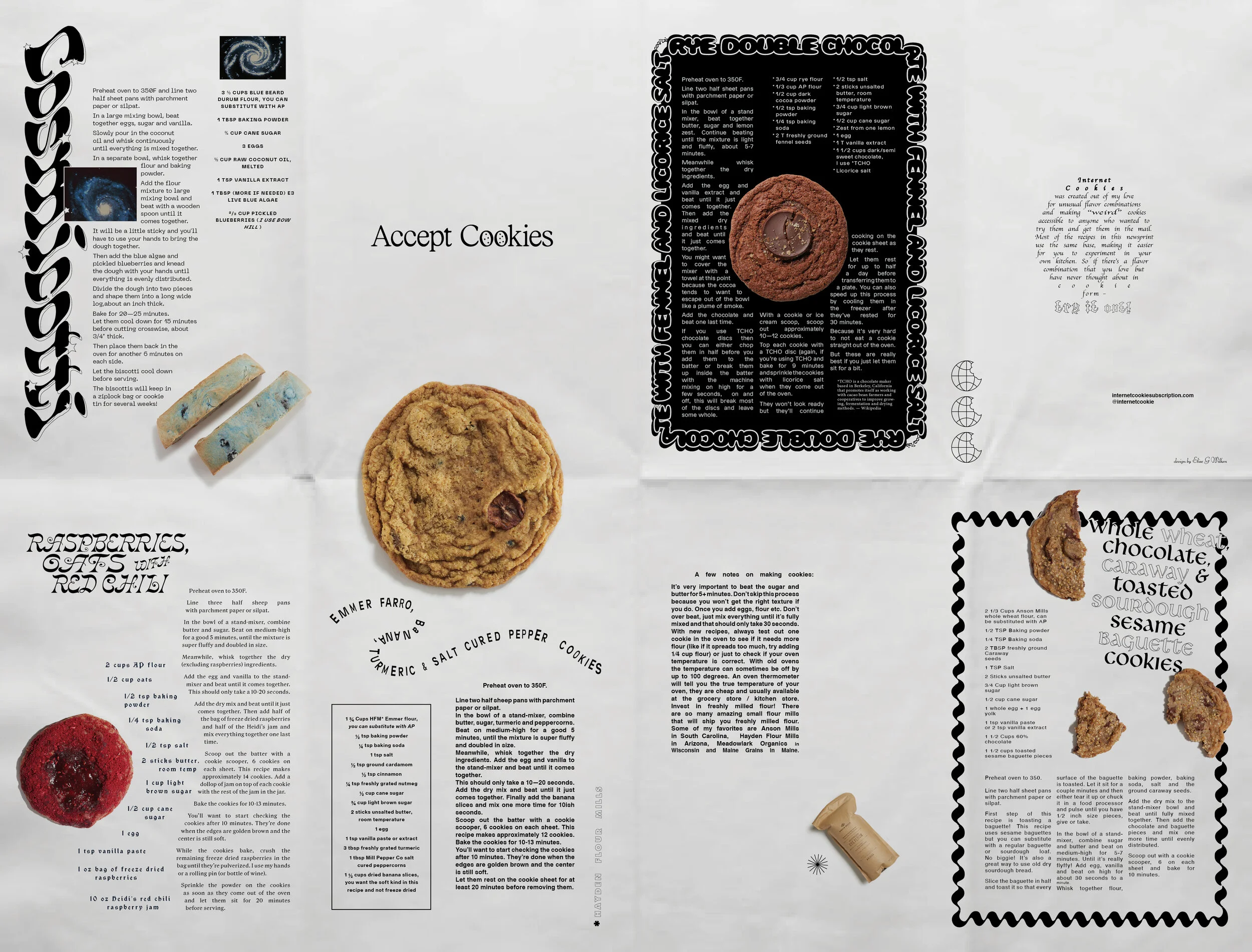 A foldout recipe book/poster for Internet Cookies. A unique flavourful cookie subscription service based out of New Mexico.